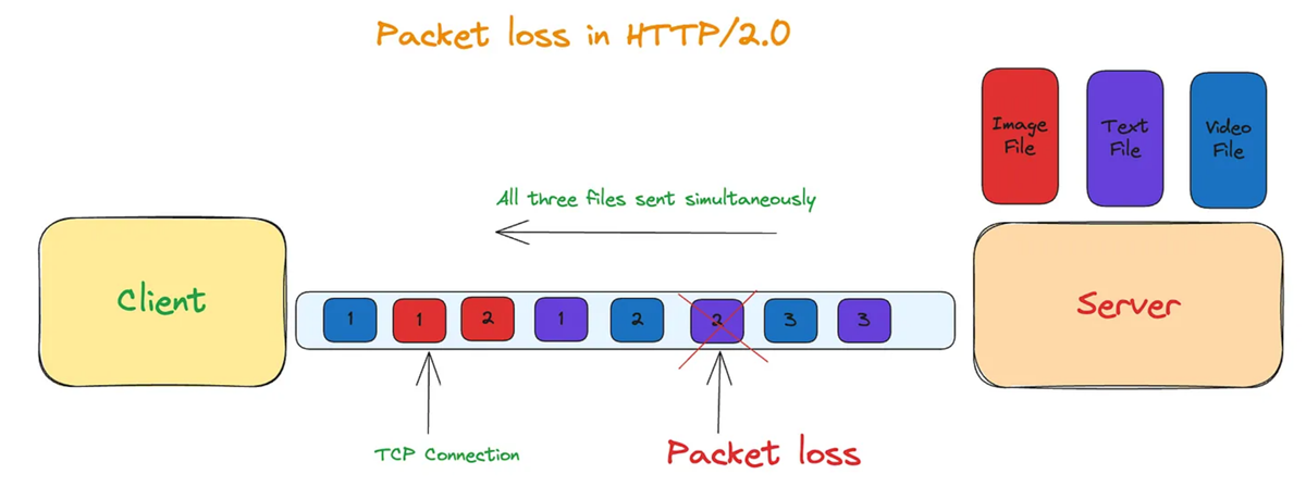 这导致了性能提升,并解决了应用层面的队头阻塞问题。然而,在TCP层面,如果发生数据包丢失,它必须等待数据包重传。