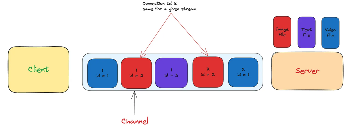 与TCP类似,QUIC也实现了多路复用。客户端可以使用单个通道同时传输多个文件。QUIC为每个流(传输的文件)创建一个UUID。它使用UUID来识别流。然后,多个流通过单个通道发送。