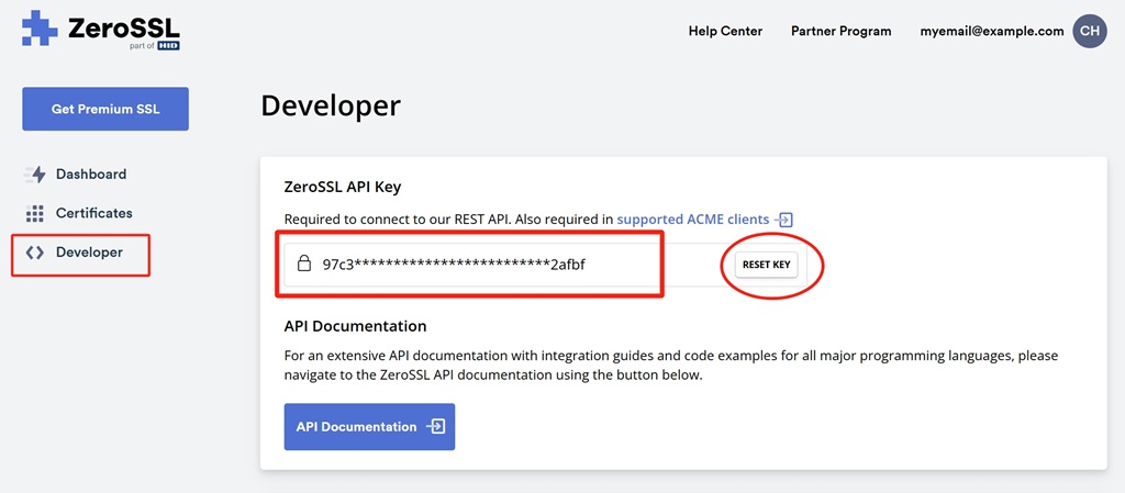 ZeroSSL CA证书签发 首先请登录ZeroSSL官网(没有账号就先注册一个,注册很简单,输入邮箱地址和密码即可)进入后台控制面板,点击左侧的【Developer】菜单,即可看到你当前账号的ZeroSSL API Key,也可以点击【RESET KEY】按钮重新生产一个ZeroSSL API Key,执行如下命令通过 API Key 获取 eab-kid 和 eab-hmac-key。