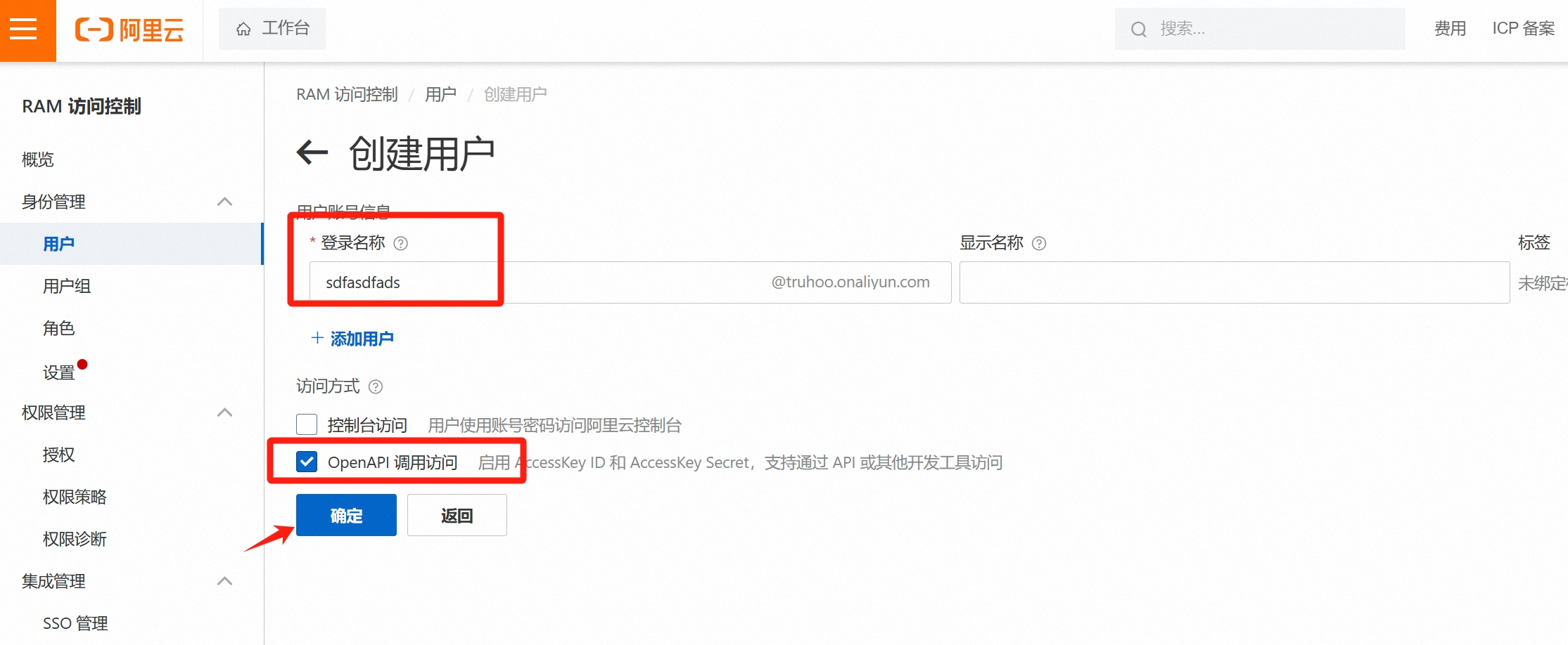 1、通过自动DNS API签发证书 通过使用域名服务商提供的 API 密钥,让acme.sh自动创建域名验证记录以申请域名证书。acme.sh 支持全球主流域名服务商的API,本文将以阿里云为例(需要你要签发证书的域名解析服务在阿里云)。更多 DNS API 支持,请查看官网支持文档:https://github.com/acmesh-official/acme.sh/wiki/dnsapi 登陆阿里云控制台 - 访问控制 RAM - 身份管理-用户-创建一个新用户-输入登录名称,勾选访问方式为“OpenAPI 调用访问”,确定创建。