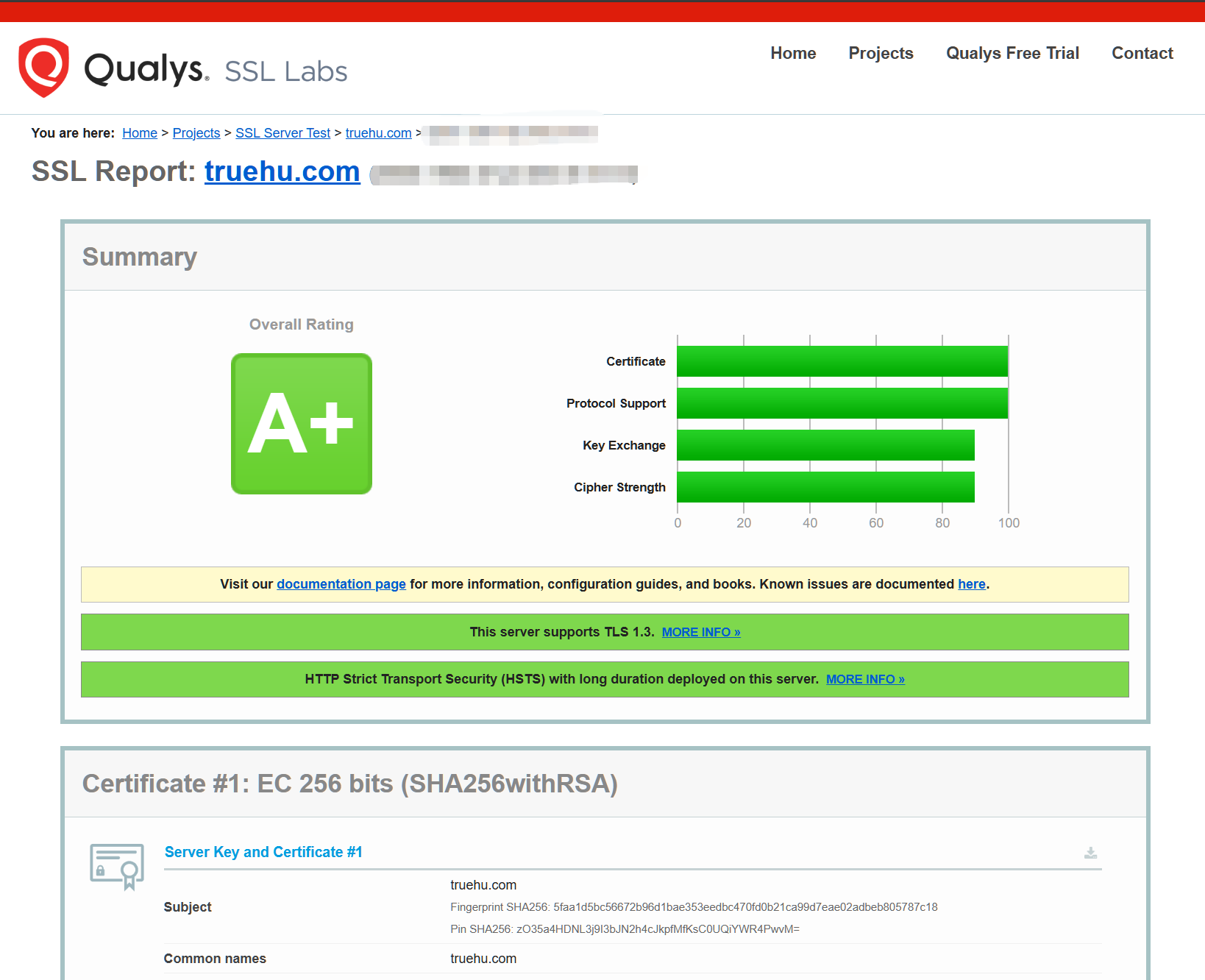 HTTPS站点部署完成后,可以通过 https://www.ssllabs.com/ssltest/ 网站进行证书安全等级验证,本站的验证效果如下: