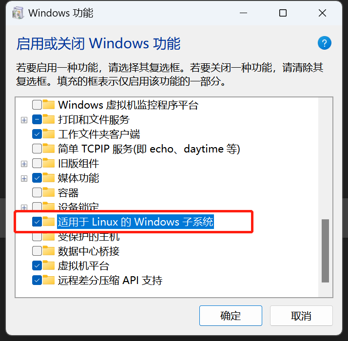 在Windows 11的搜索栏中搜索功能,选择“启用或关闭Windows功能”(如果没有,或者关闭了搜索栏,可以在控制面板-程序-程序和功能中找到此项),找到“适用于 Linux 的 Windows 子系统”并选择它,然后单击“确定”按钮,按提示完成操作即可,如下图: